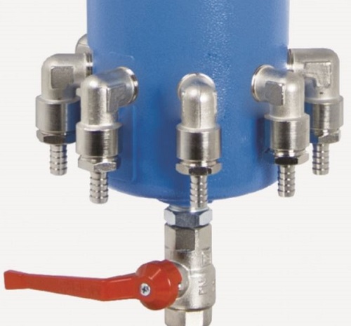 WOS-CD can evenly distribute collected condensate between up to three WOS 35 water oil separators. WOS-CD is equipped with flow distributor on the inlet port, up to 8 hose tail connections mounted on elbows for convenient outlet, manual ball valve for cleaning purpose and vent port for safe aeration. Optional wall mounting kit is available. Maximum capacity in regard to free air delivery, when connected to WOS 35 is 120 Nm3/min.